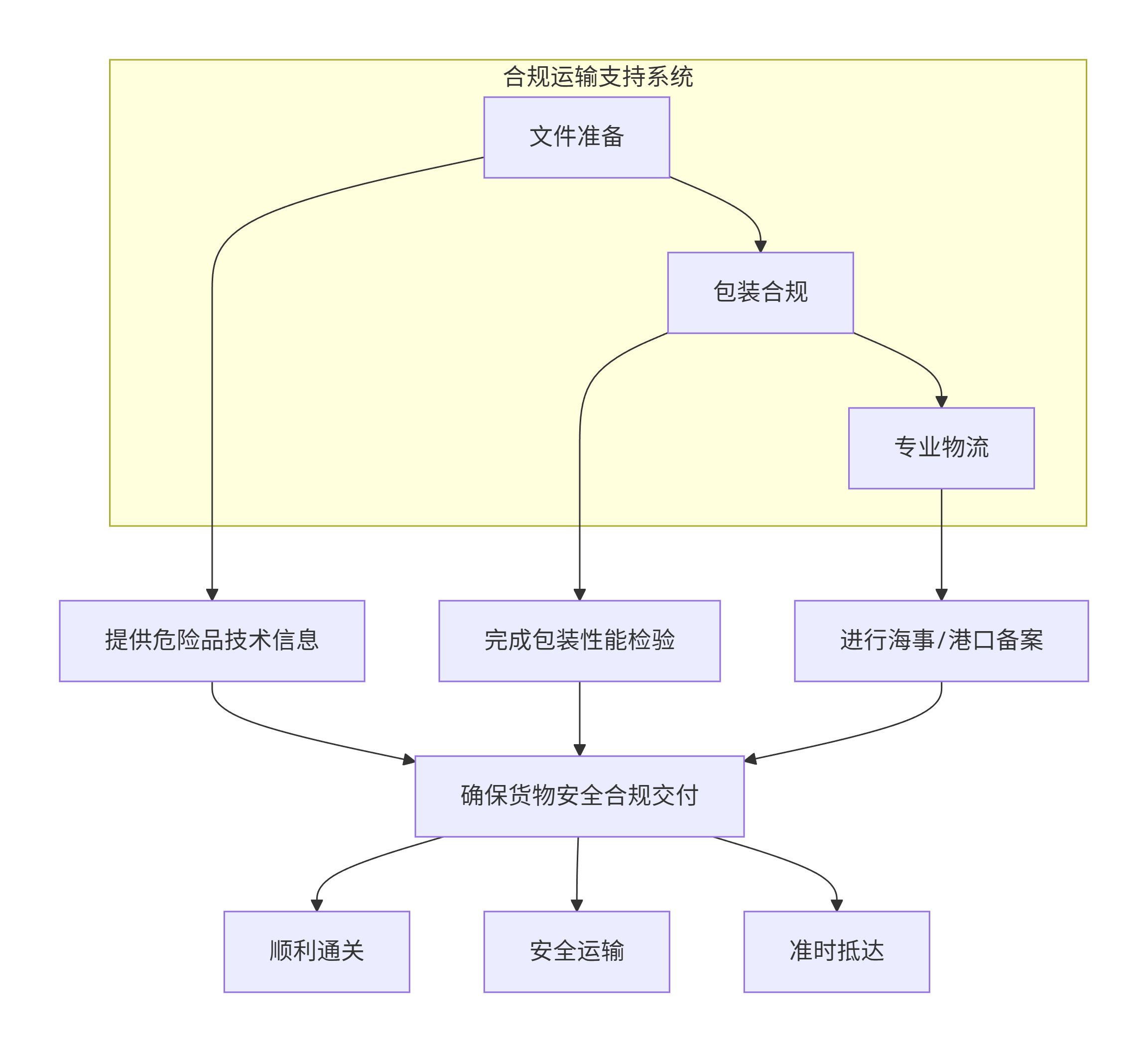 在实际操作中,货物的合规运输还依赖于一个完整的支持系统。下图梳理了从生产到运输的关键环节、支持事项及最终交付的核心目标: