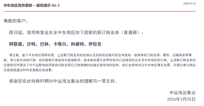 同一天内连续发布两版通知,并在更正版中重点强调运输路径调整——这个细节说明,恢复订舱并不等于恢复传统运输模式,船公司正在“恢复服务”与“控制风险”之间寻找平衡。